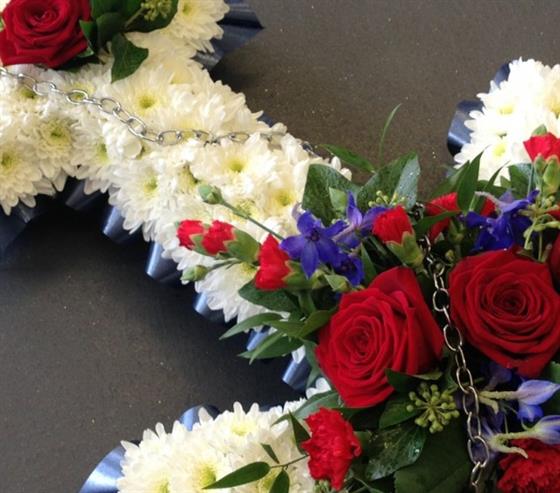 An anchor shaped design, representing strength & stabilit. Made using a mass of white double spray chrysanthemums with a top spray of roses and thistles. The tribute is finished with green foliage and a silver cord. 3ft